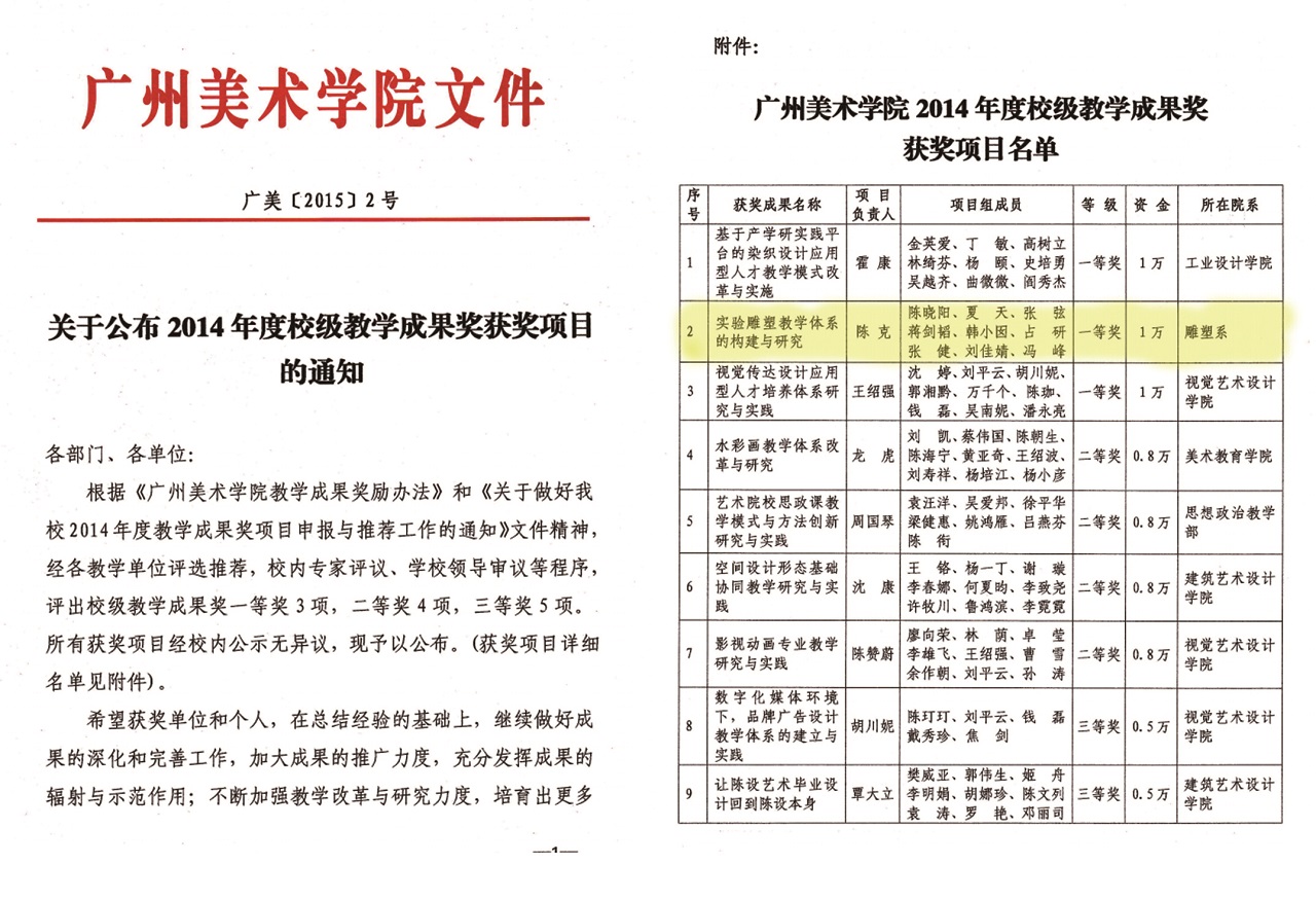 实验雕塑工作室教学成果获奖文件