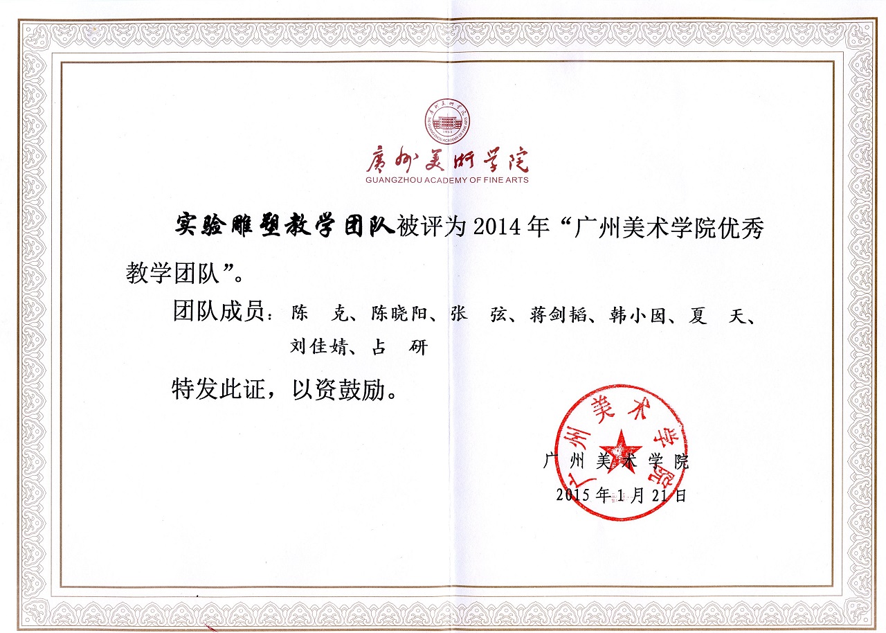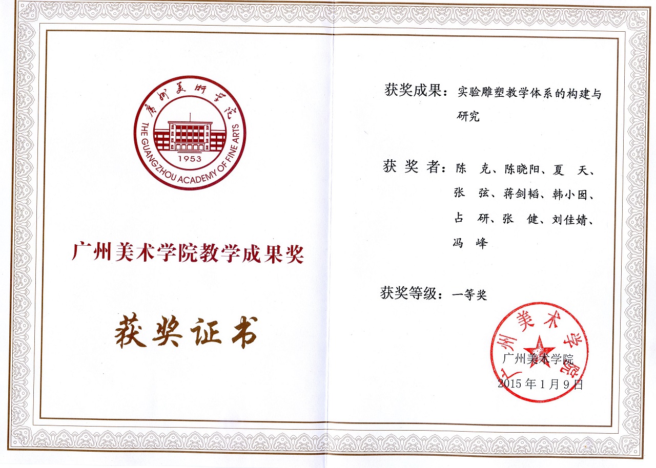 实验雕塑系列课程属于雕塑专业的精品课程与特色课程的重要组成部分,2014年,“实验雕塑教学体系的构建与研究”获广州美术学院教学成果奖,实验雕塑教学团队被评为“广州美术学院2014年优秀教学团队”,同时于2015年被评为“广东省优秀教学团队”。